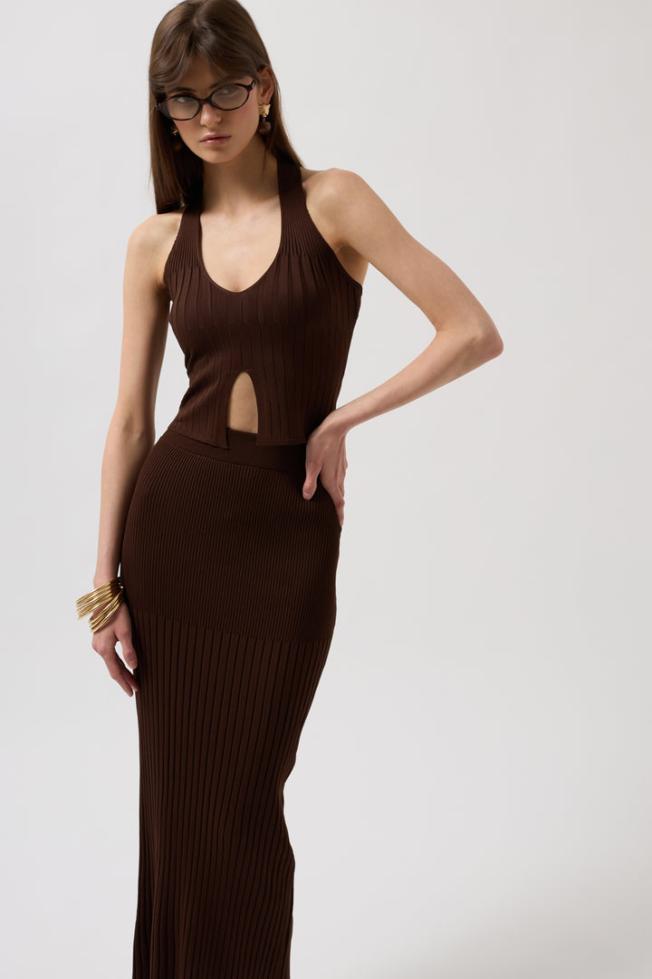 V Detay Dokulu Crop Kahverengi Bluz