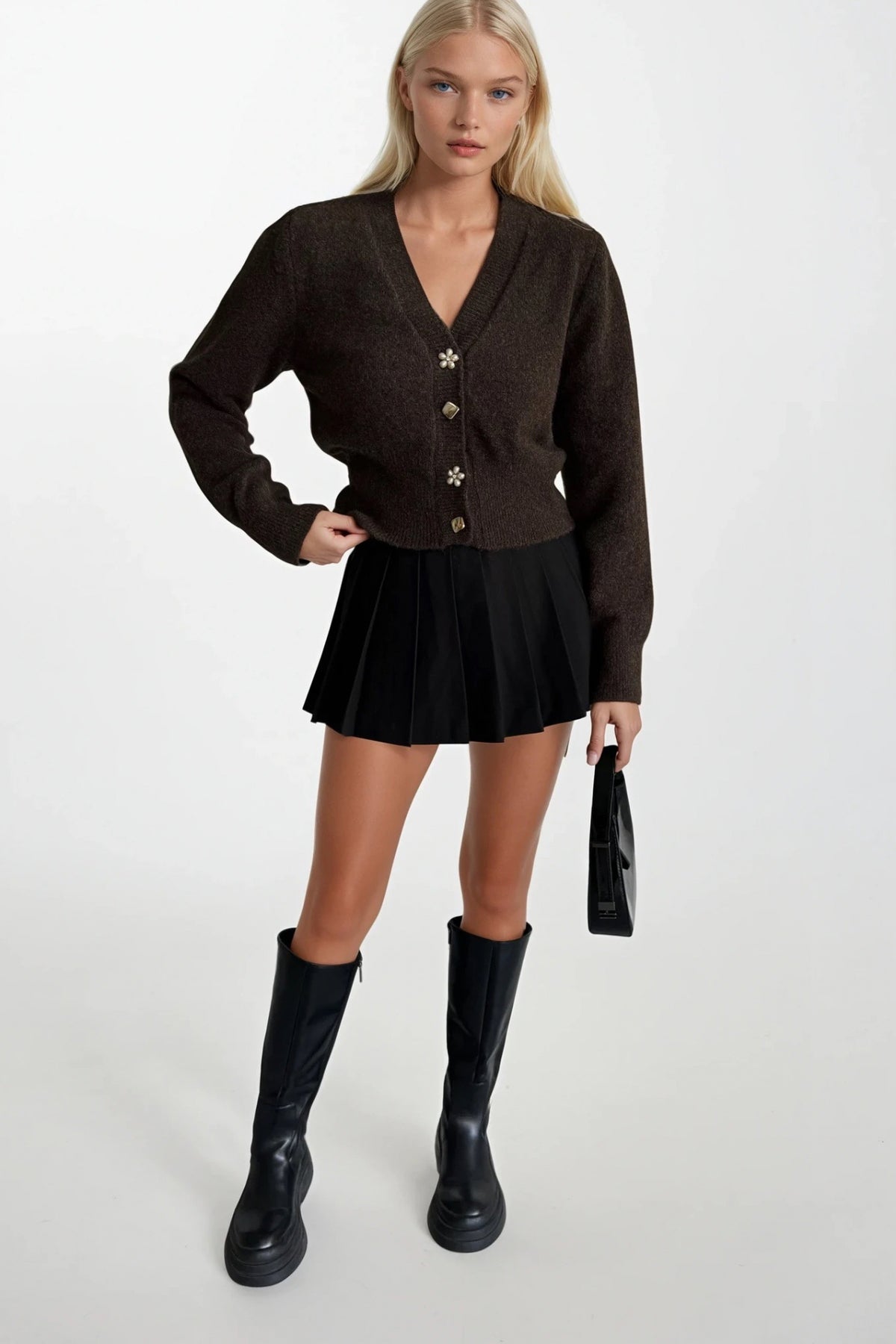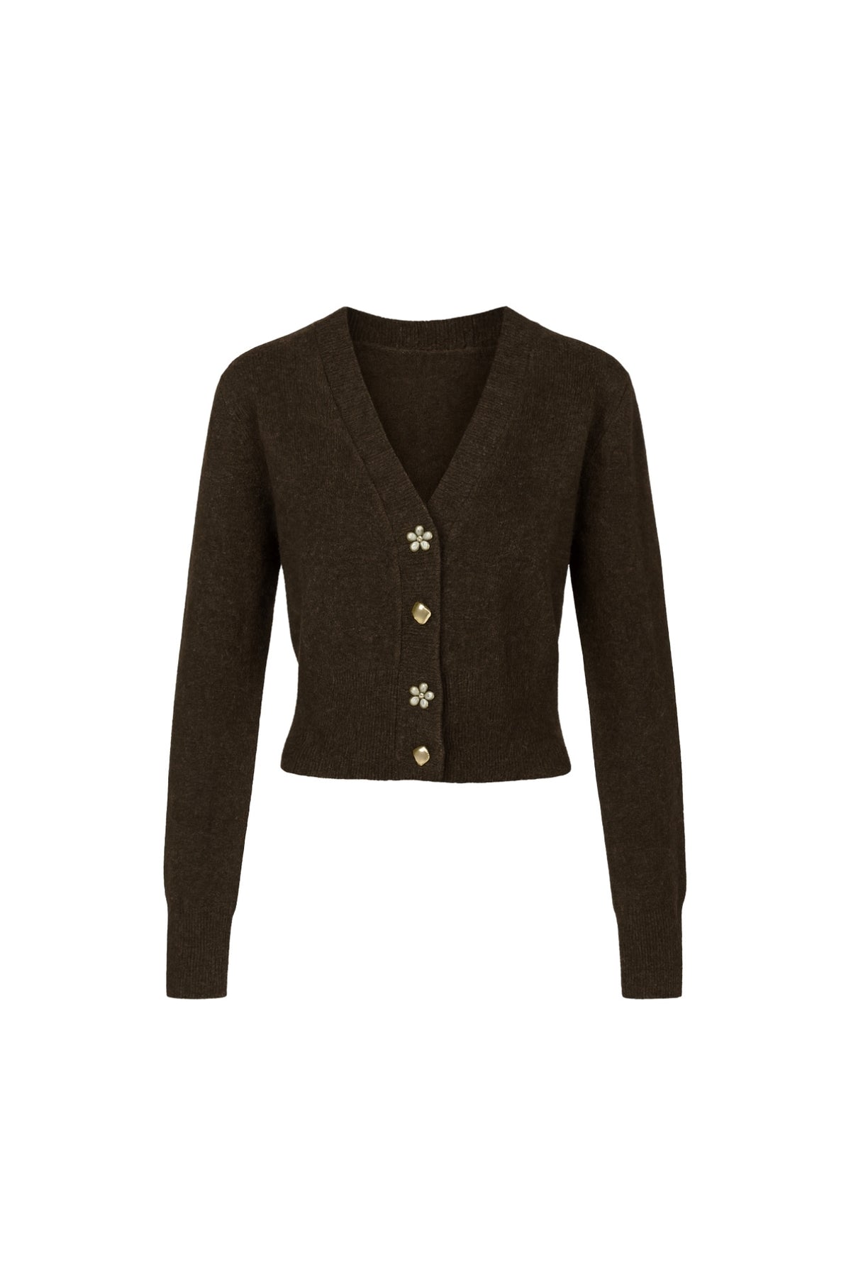 V Yaka Aksesuar Detay Kahverengi Triko Hırka