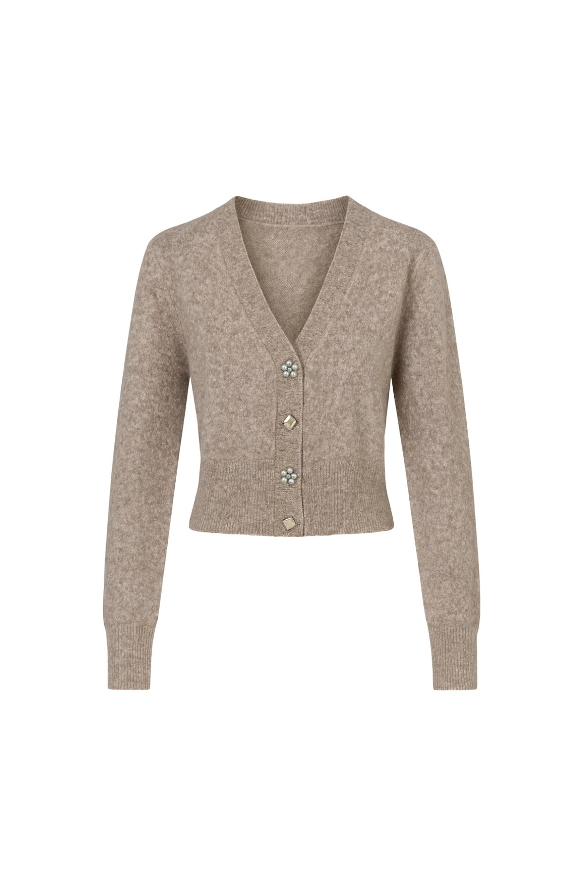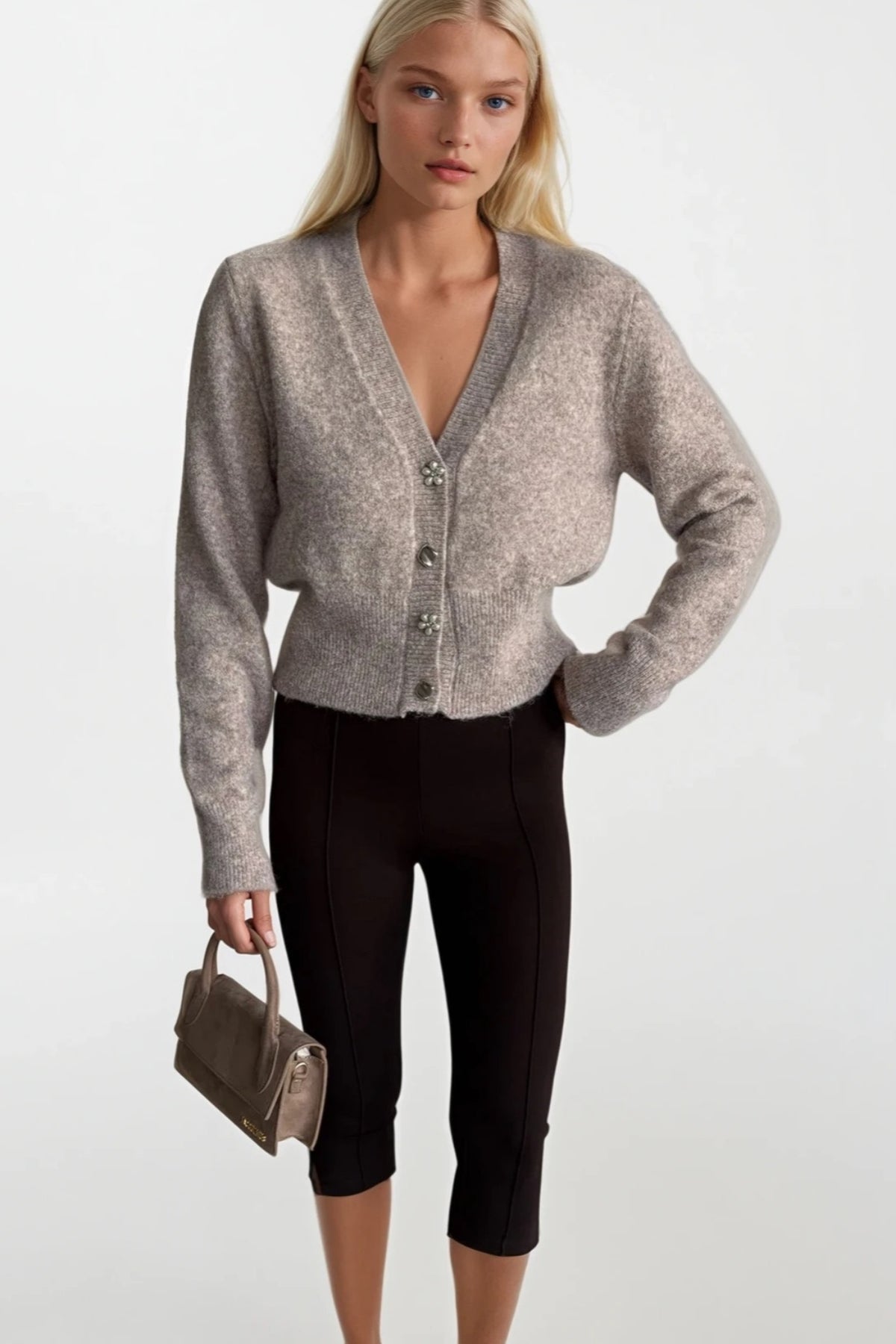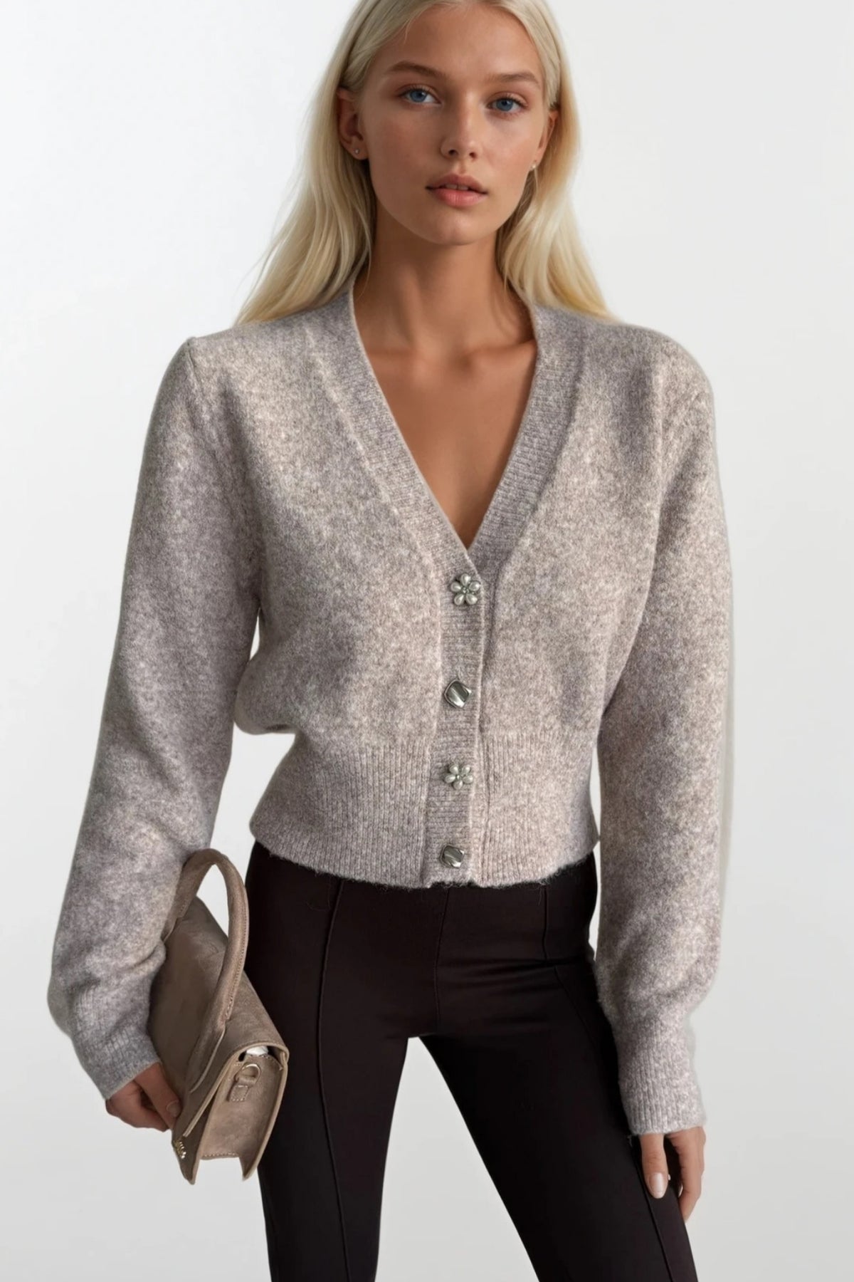 V Yaka Aksesuar Detay Taş Triko Hırka