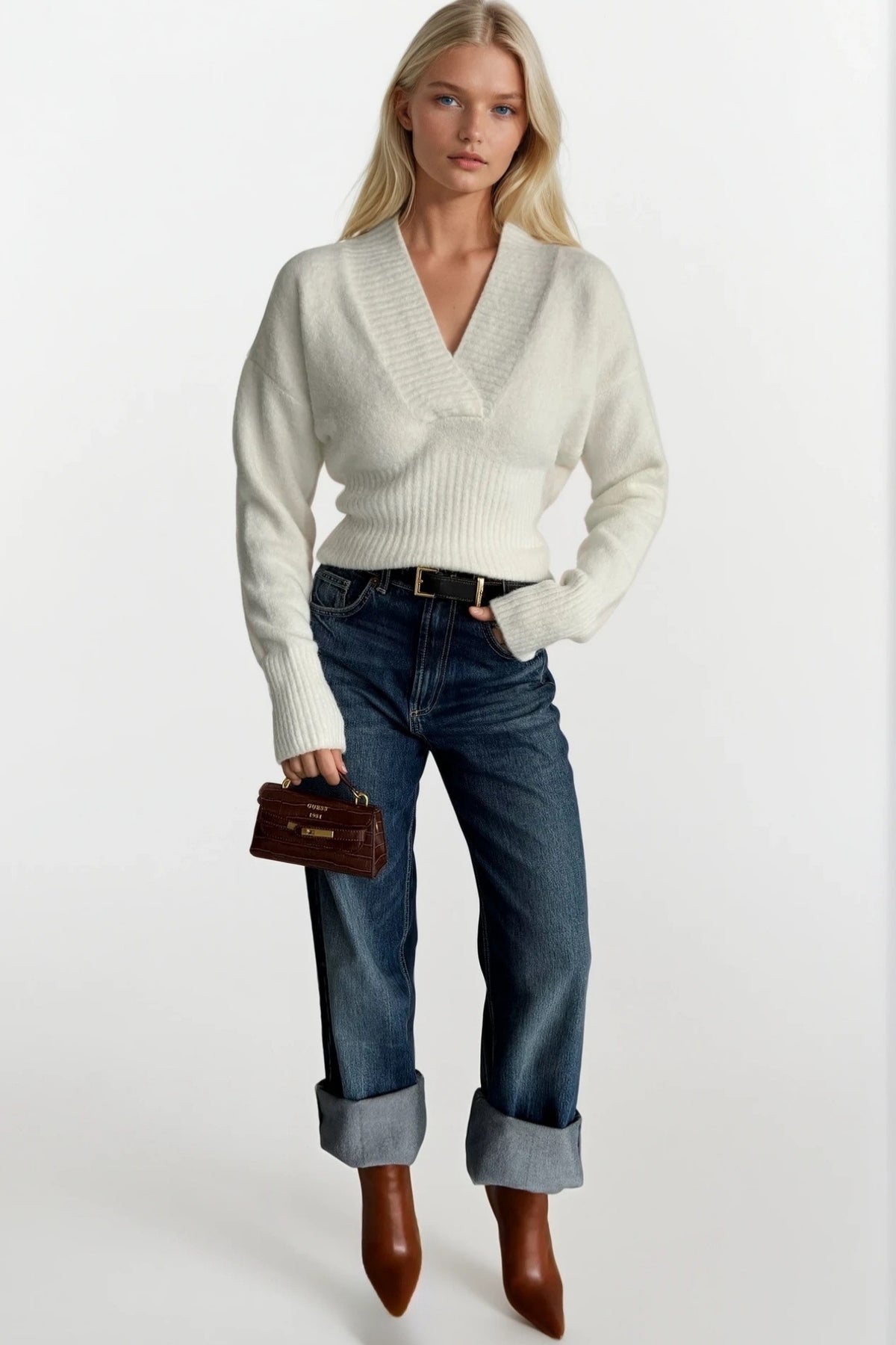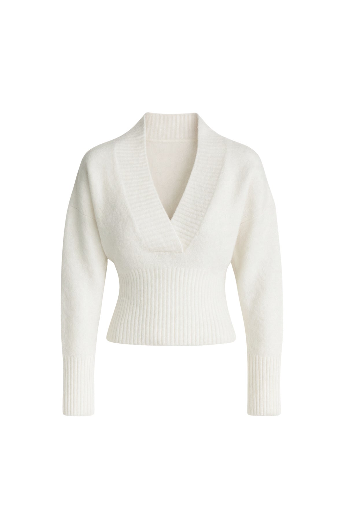 V Yaka Bel Oturtmalı Ekru Triko Kazak