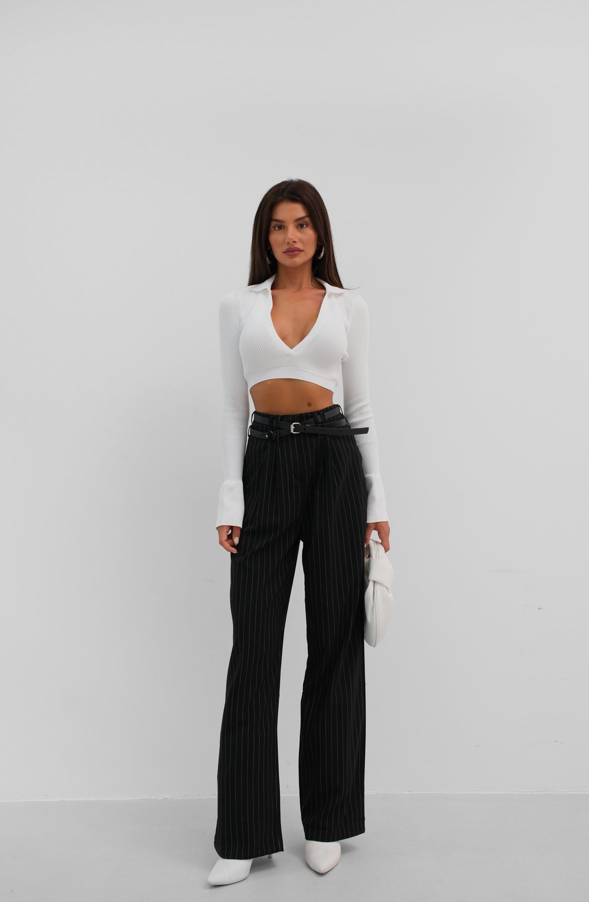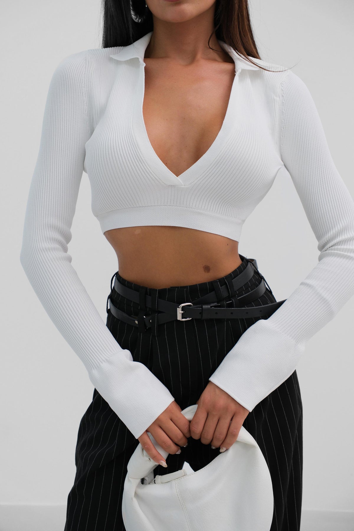 V Yaka Polo Yaka Crop Beyaz Kazak
