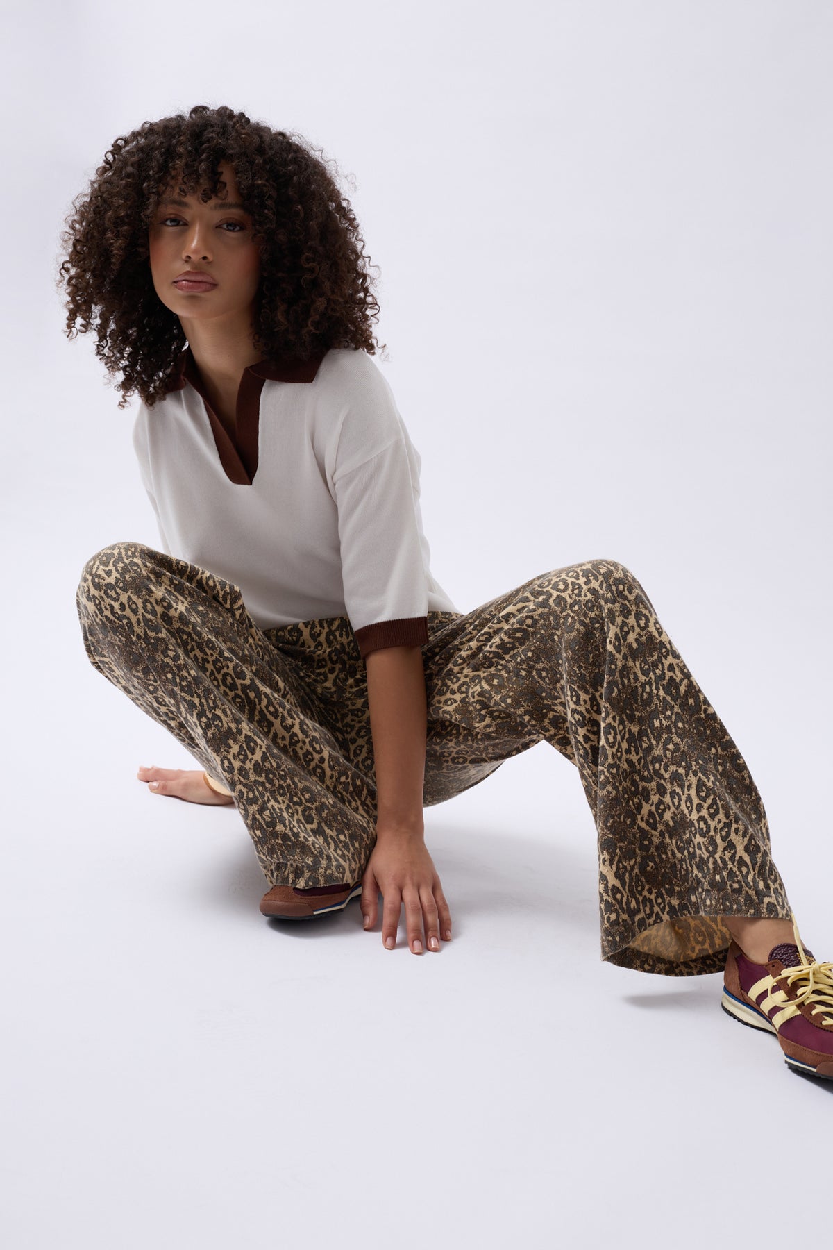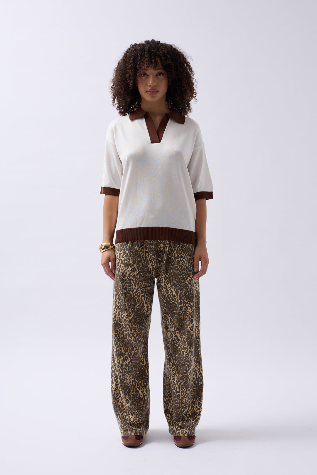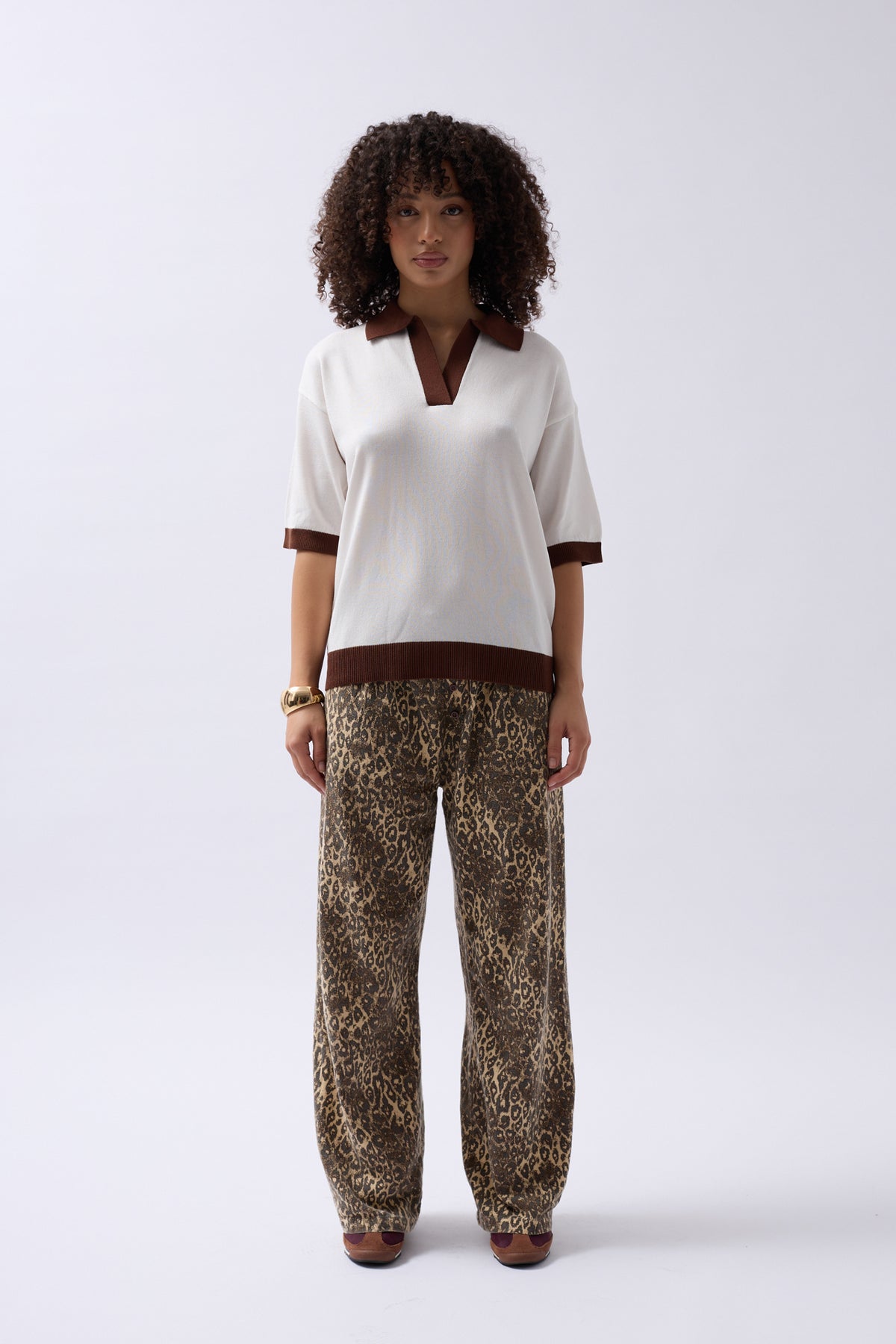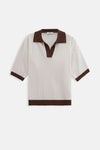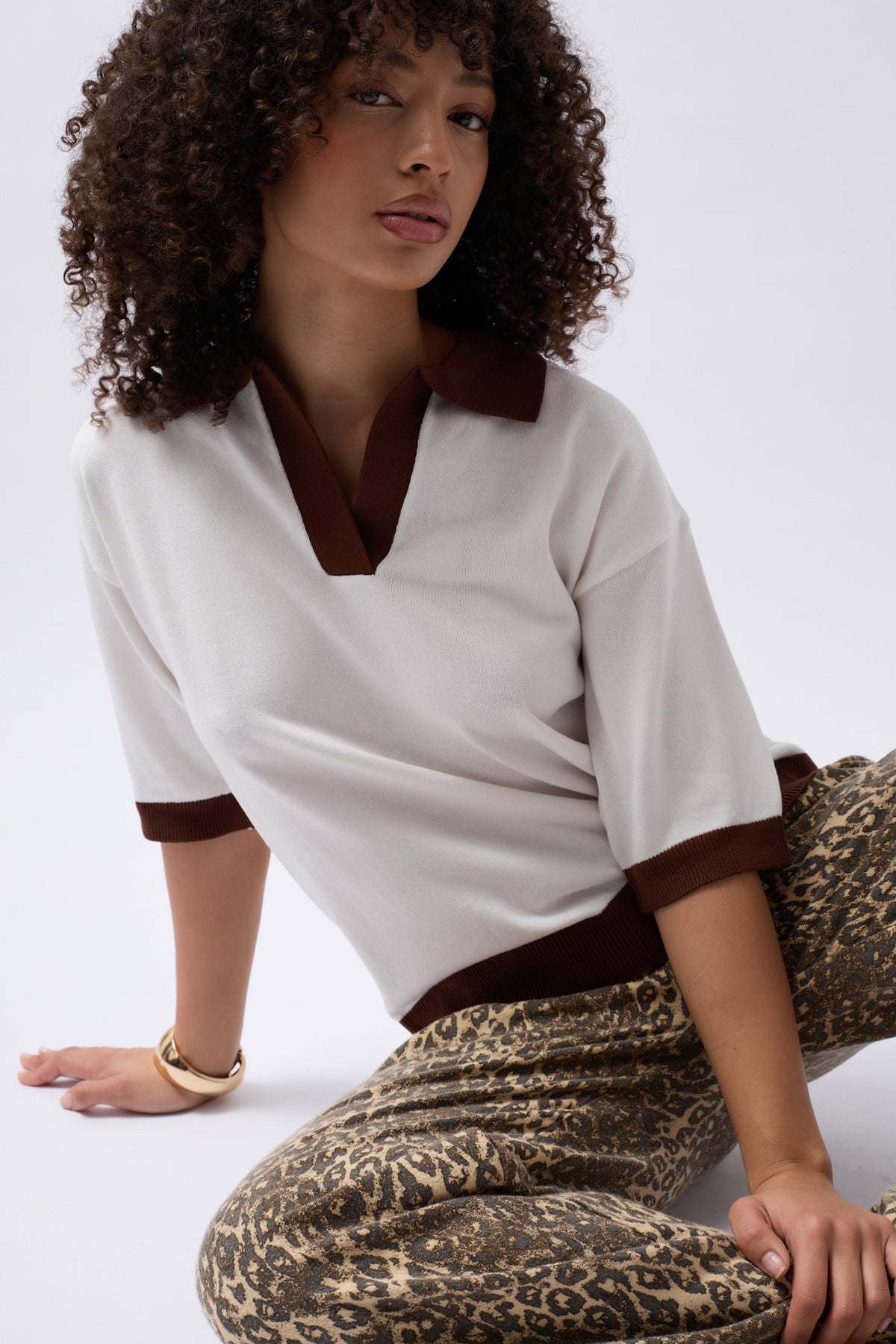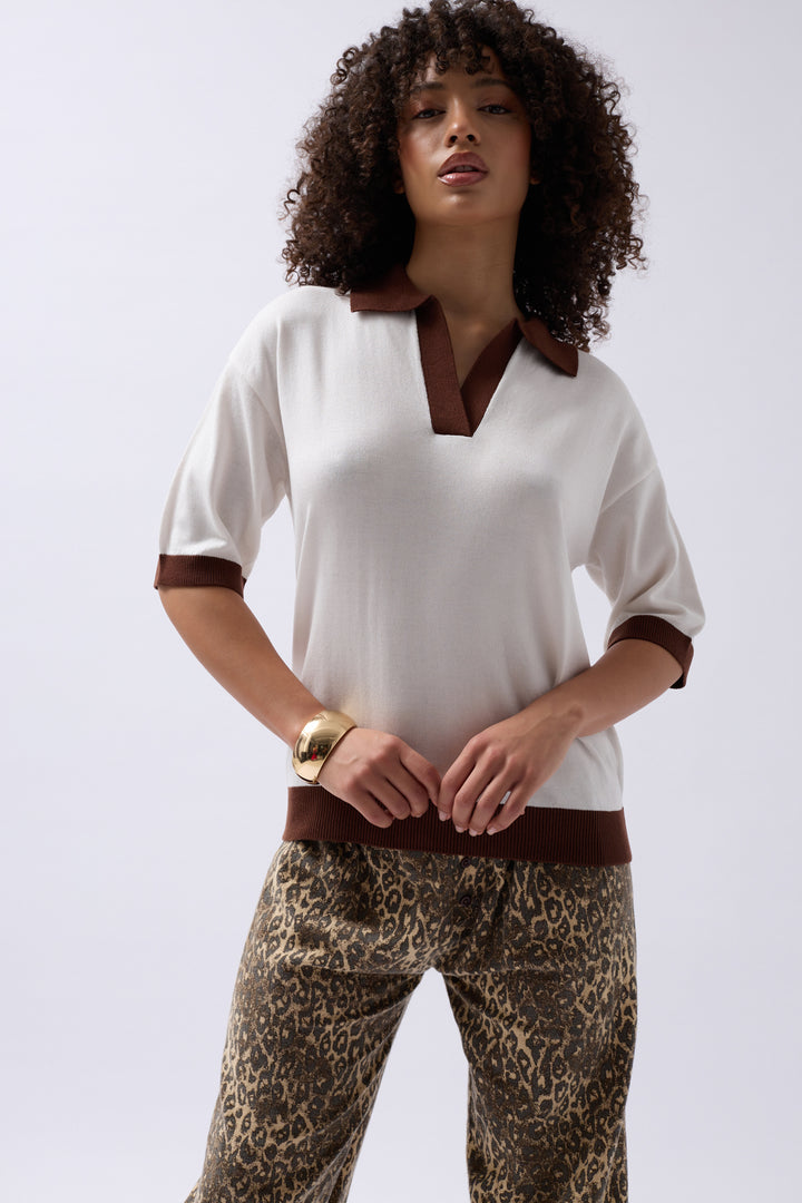 V Yaka Şerit Detay Beyaz Kahverengi T-Shirt