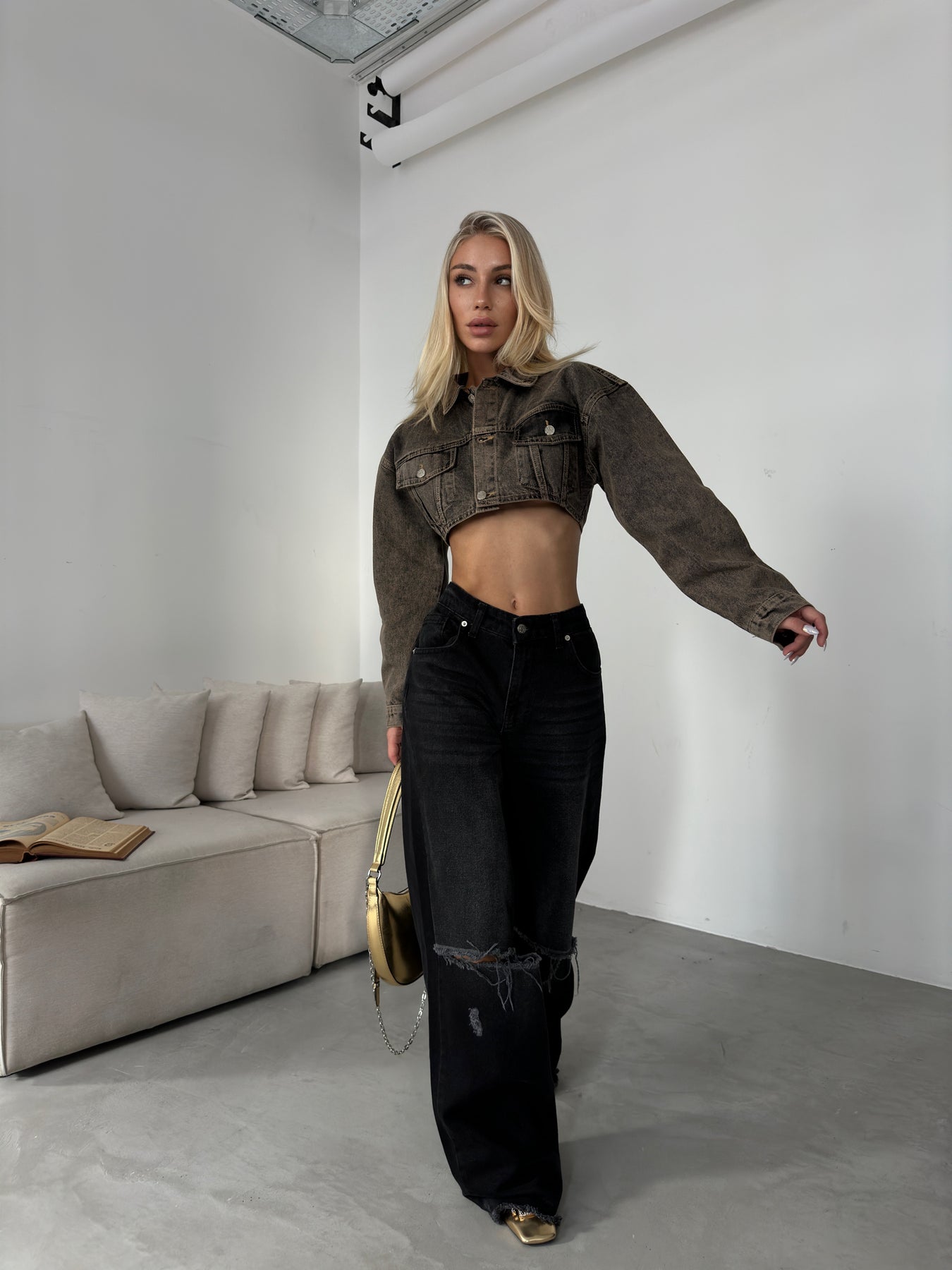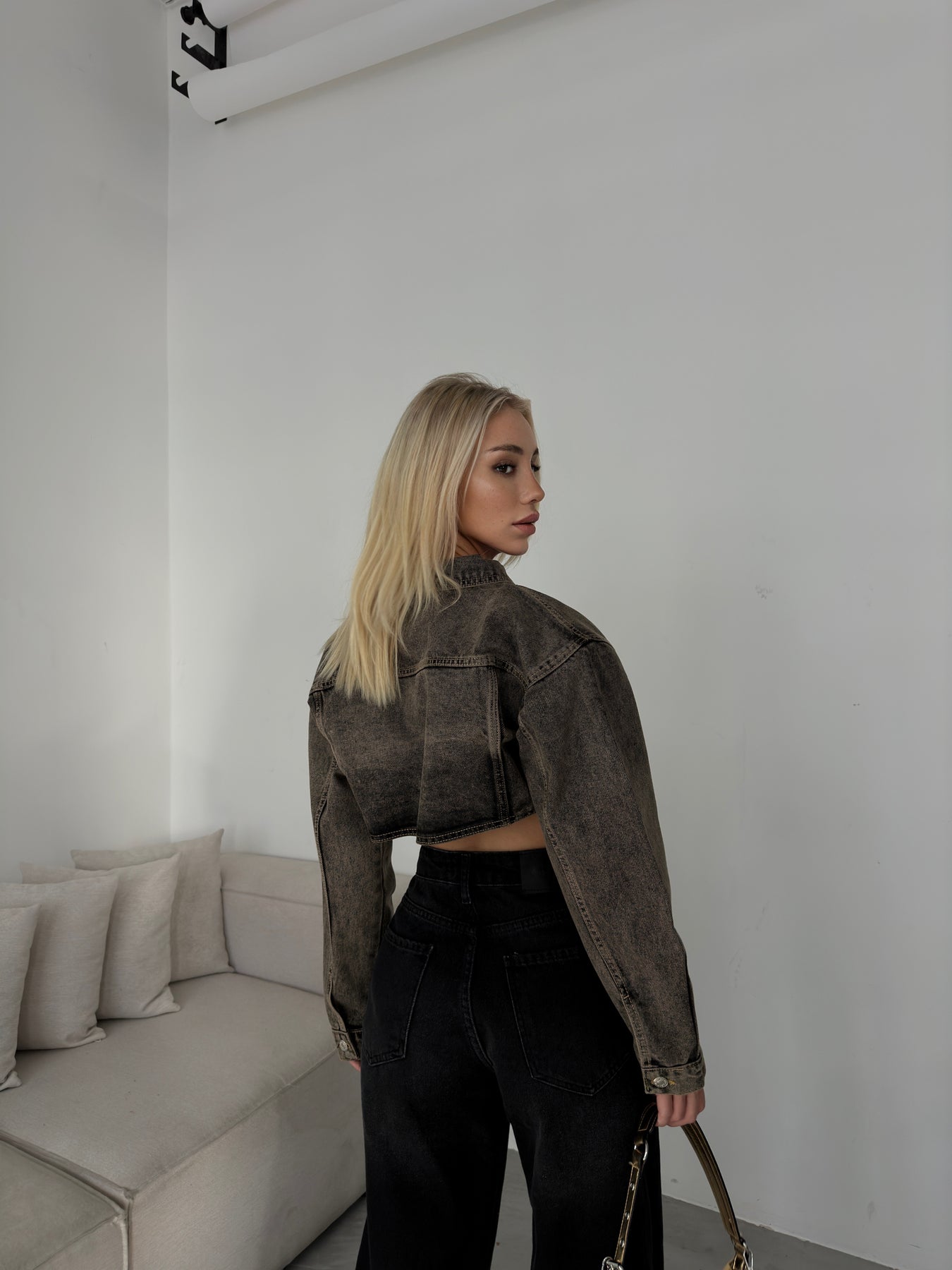 Vatkalı, Cepli, Şişme, Uzun Kolllu, Ultra Crop Denim Ceket
