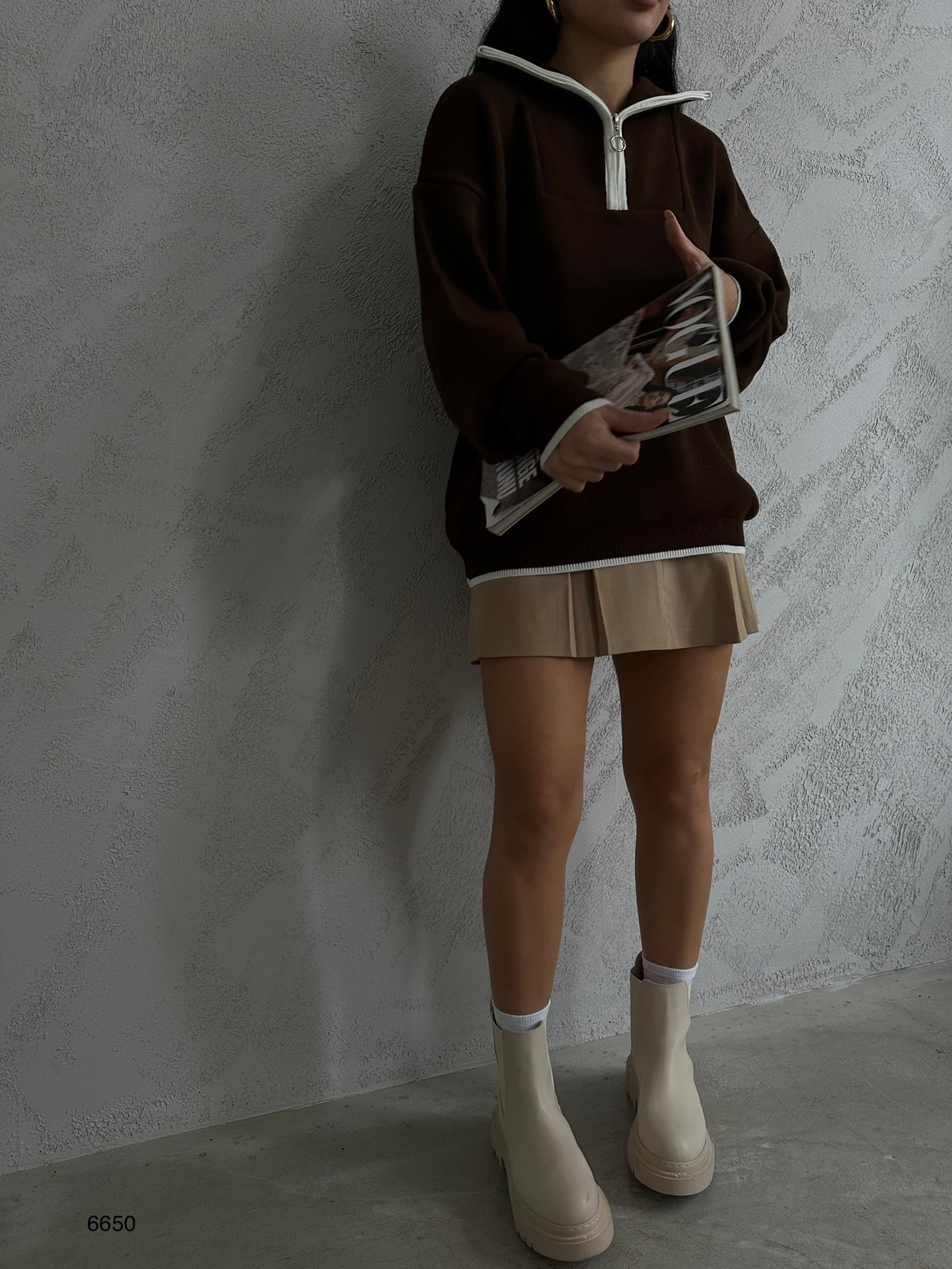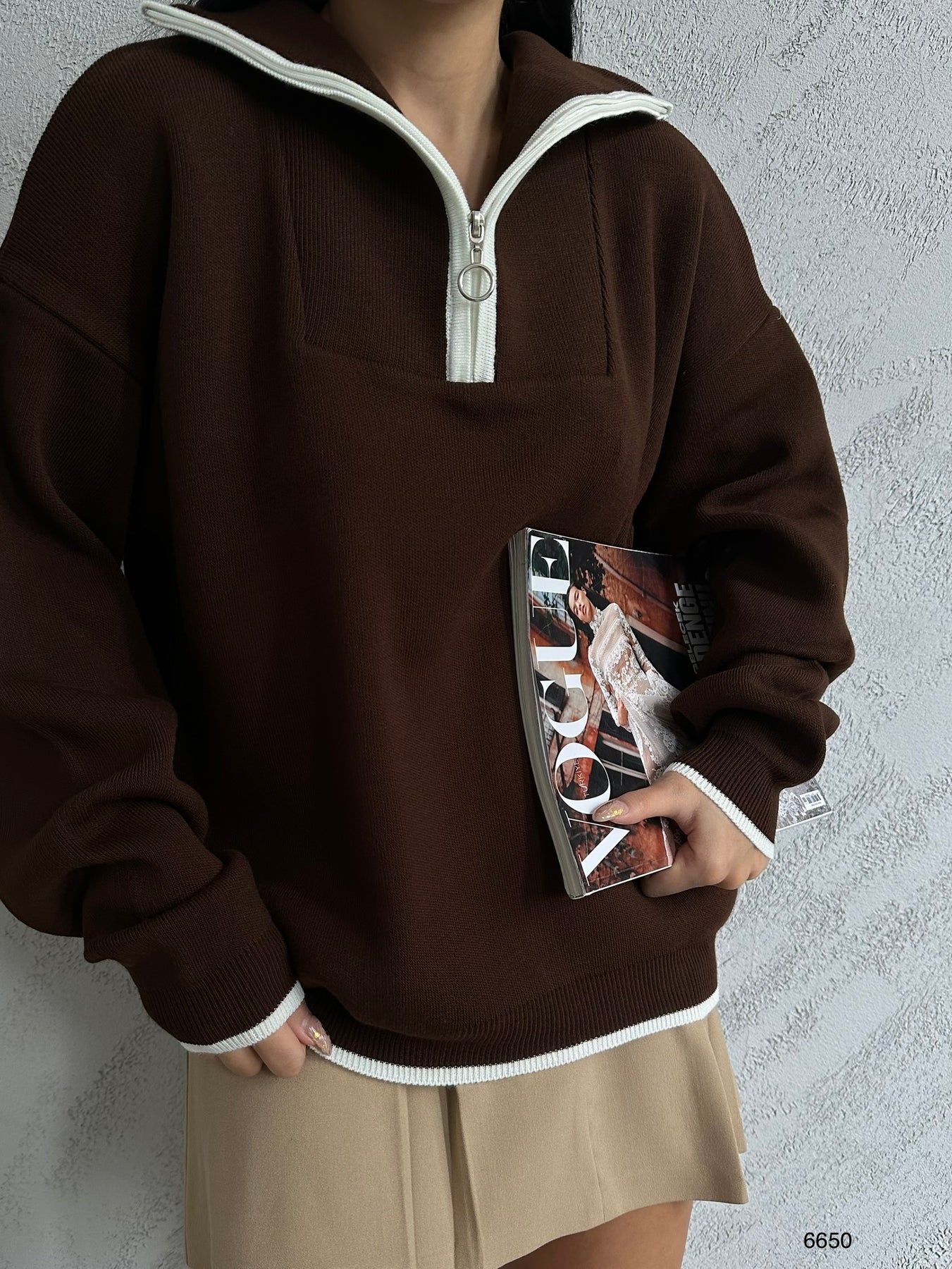 Yaka Fermuar Detay Kahverengi Oversize Kazak