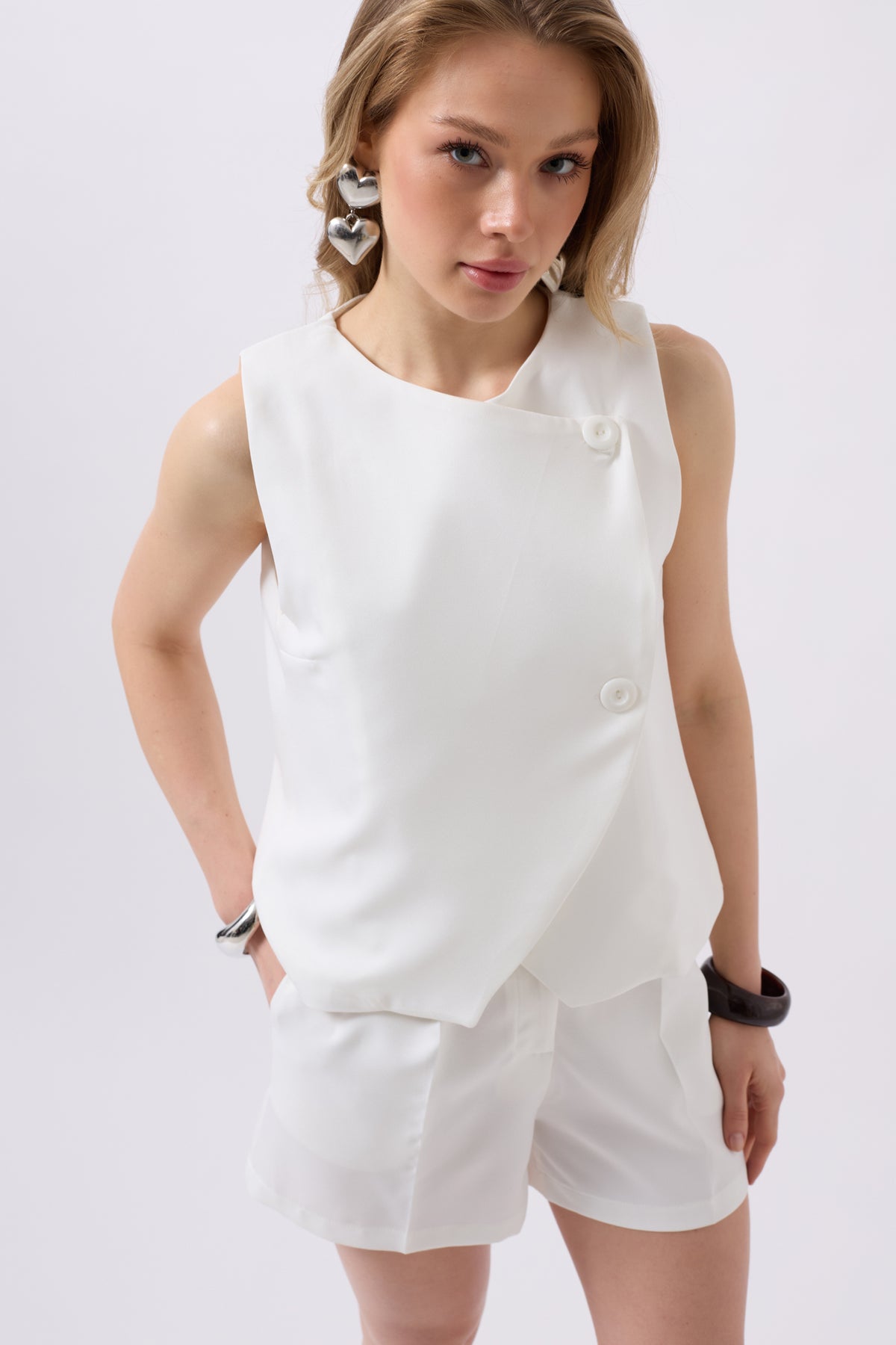 Yandan Düğmeli Dokuma Beyaz Yelek