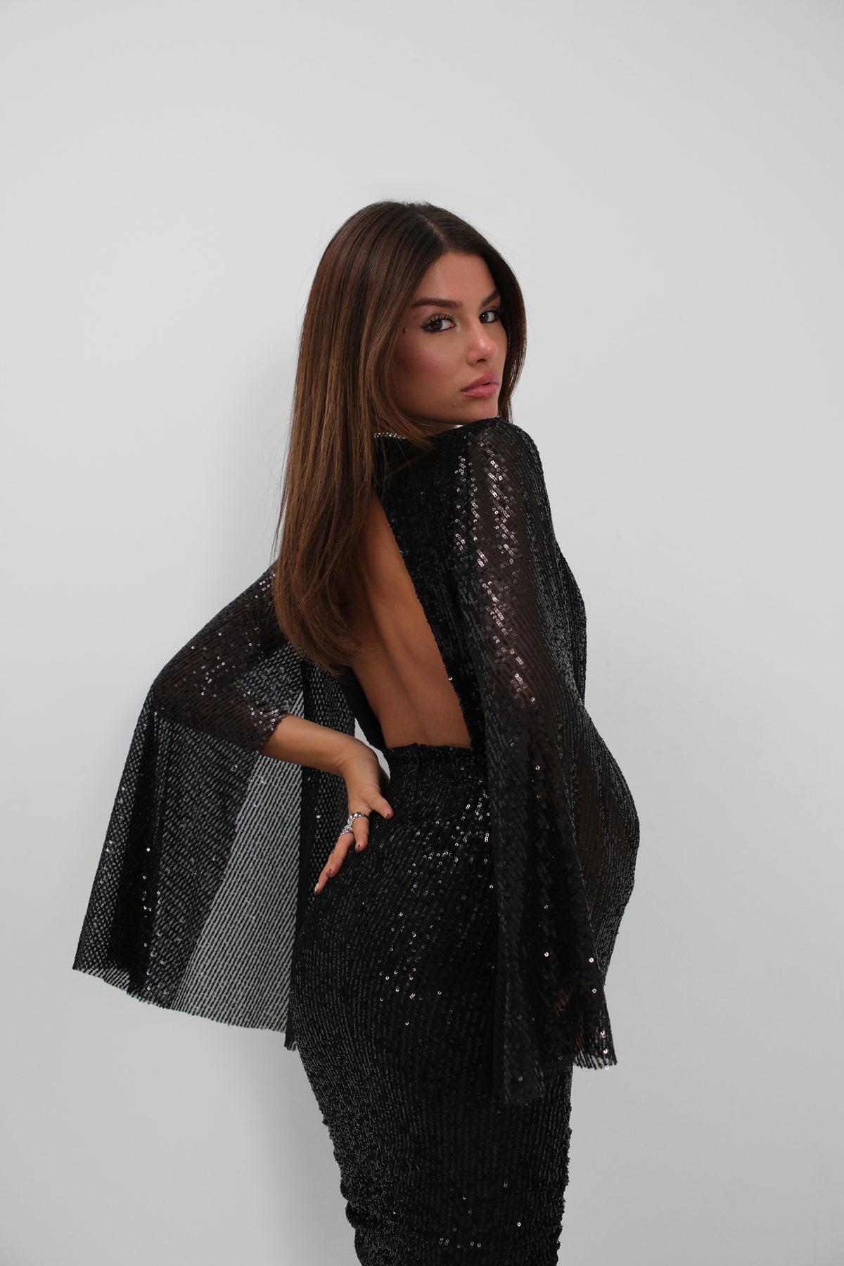 Yarasa Kol Kruvaze Sırt Dekolteli Pullu Siyah Elbise