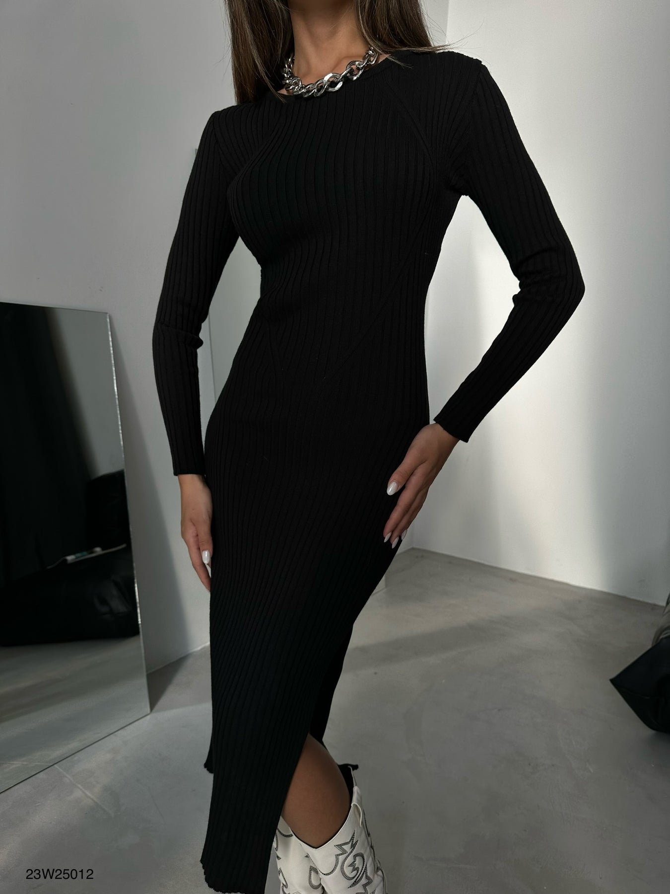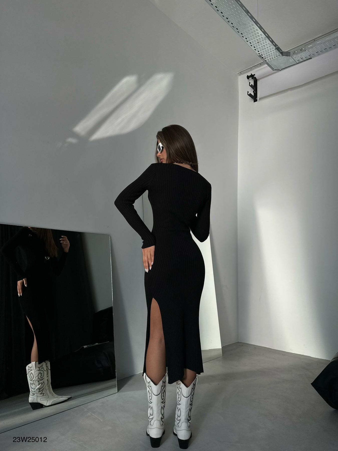 Bisiklet Yaka Uzun Kollu Midi Boy Yırtmaçlı Triko Elbise