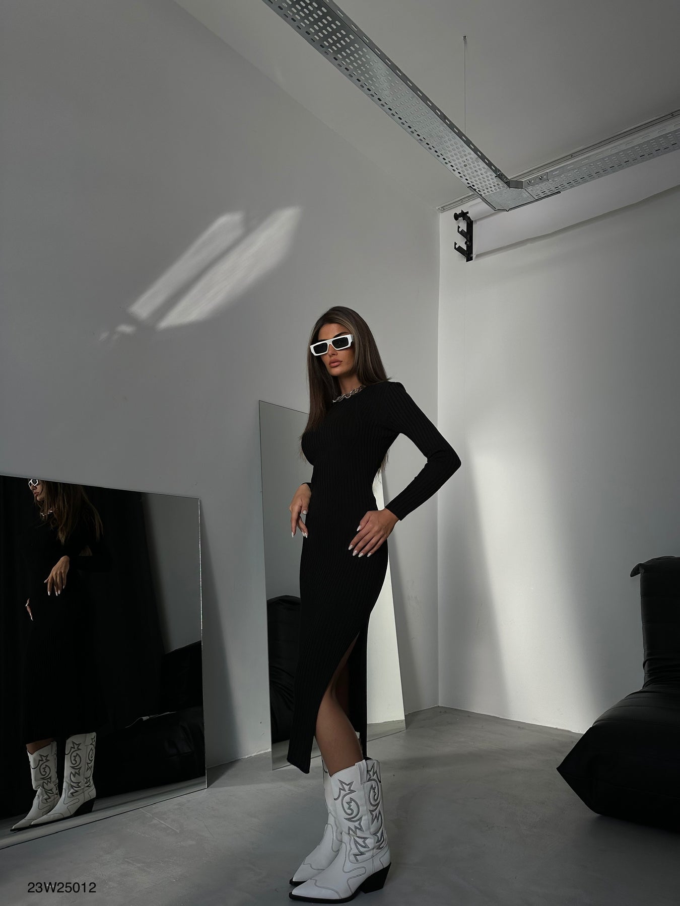 Uzun Kollu, Oval Yaka, Yandan Yırtmaçlı, Midi Boy Triko Elbise
