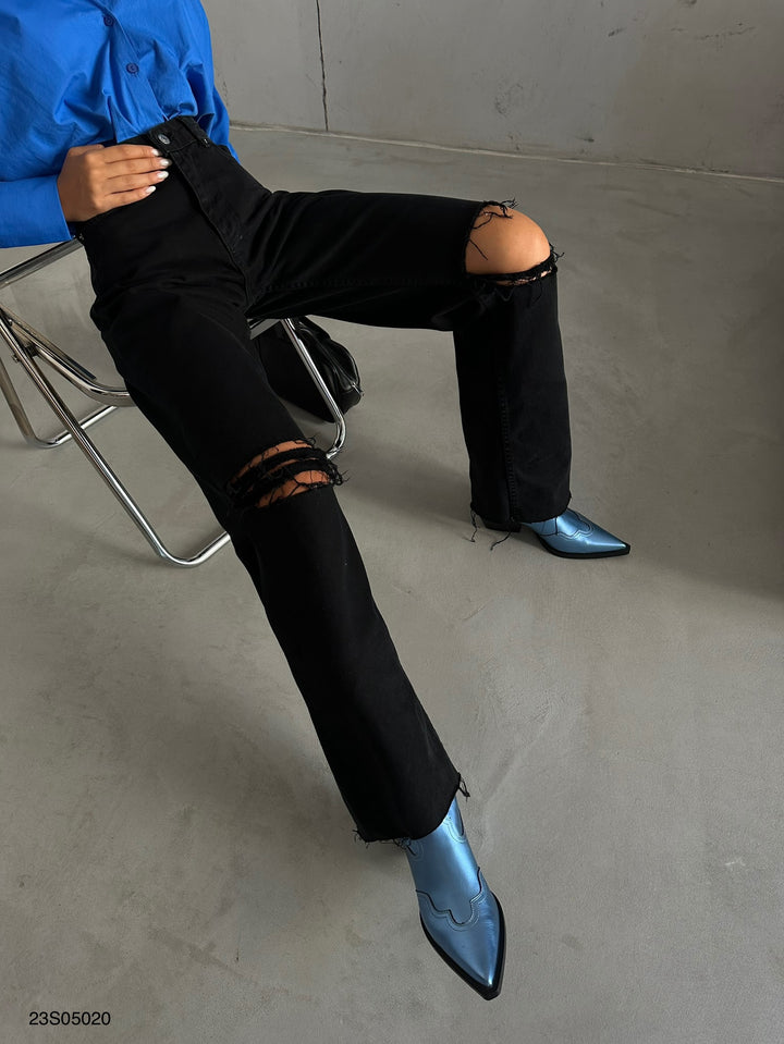 Yüksek Bel Lazerli Siyah Jean